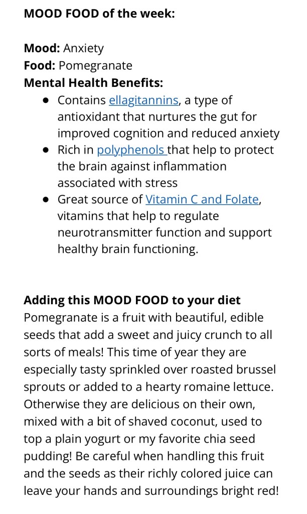 Dr Uma’s Mood Food – pomegranate Posted byChilly BellaNovember 20, 2022December 3, 2022Posted inFood for thoughtTags:Dr Uma, Find the Joy, healthy snacks, mental health, mindful eating, nutrition, pomegranate Extract from the weekly newsletters Share this: Click to share on X (Opens in new window) X Click to share on Facebook (Opens in new window) Facebook More Click to share on Pinterest (Opens in new window) Pinterest Click to email a link to a friend (Opens in new window) Email Like Loading... Published by Chilly Bella Ambassador for good food, good mood and Fine Art Photographer, with a love for the simple joys and sharing my best life with my beautiful family. View more posts