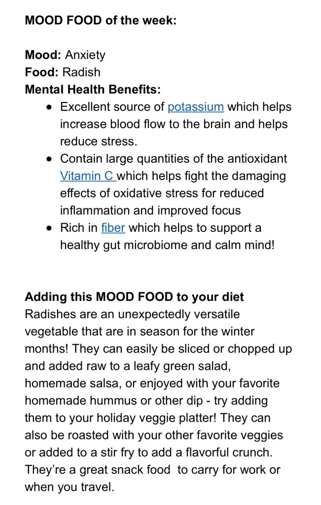 Dr Uma’s Mood Food – Radish Posted byChilly BellaDecember 17, 2022December 28, 2022Posted inFood for thoughtTags:Dr Uma, healthy snacks, mindful eating, nutrition, radish’s Extracted from the weekly newsletter Share this: Click to share on X (Opens in new window) X Click to share on Facebook (Opens in new window) Facebook More Click to share on Pinterest (Opens in new window) Pinterest Click to email a link to a friend (Opens in new window) Email Like Loading... Published by Chilly Bella Ambassador for good food, good mood and Fine Art Photographer, with a love for the simple joys and sharing my best life with my beautiful family. View more posts