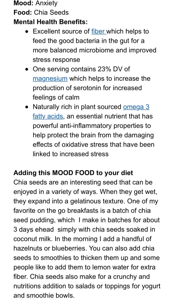 Dr Uma’s Mood Food – Chia Seeds Posted byChilly BellaJanuary 24, 2023Posted inDr Uma, Expert Newsletter, find a healthier you, find your inspirationTags:amino acids, chia seeds, Dr Uma, Find the Joy, healthy fats, healthy snacks, mental health, mindful eating, nutrition, Protein Extract from weekly newsletter Share this: Click to share on X (Opens in new window) X Click to share on Facebook (Opens in new window) Facebook More Click to share on Pinterest (Opens in new window) Pinterest Click to email a link to a friend (Opens in new window) Email Like Loading... Published by Chilly Bella Ambassador for good food, good mood and Fine Art Photographer, with a love for the simple joys and sharing my best life with my beautiful family. View more posts