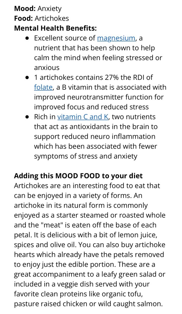 Dr Uma’s Mood Food – Artichokes Posted byChilly BellaMarch 11, 2023Posted inDr Uma, Expert Newsletter, find a healthier you, Find the Joy, find time for you, find your inspiration, Food for thoughtTags:anxiety, artichoke, healthy snacks, mental health, mindful eating, nutrition Extract from weekly newsletter Share this: Click to share on X (Opens in new window) X Click to share on Facebook (Opens in new window) Facebook More Click to share on Pinterest (Opens in new window) Pinterest Click to email a link to a friend (Opens in new window) Email Like Loading... Published by Chilly Bella Ambassador for good food, good mood and Fine Art Photographer, with a love for the simple joys and sharing my best life with my beautiful family. View more posts