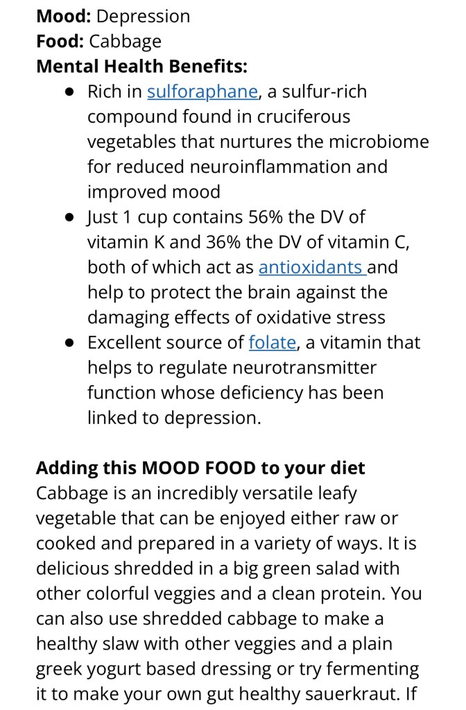 Dr Uma’s Mood Food – Cabbage Posted byChilly BellaMarch 19, 2023Posted inDr Uma, Expert Newsletter, find a healthier you, Find the Joy, find time for you, find your inspiration, Food for thoughtTags:cabbage, healthy snacks, mental health, mindful eating, nutrition Extract from weekly newsletter Share this: Click to share on X (Opens in new window) X Click to share on Facebook (Opens in new window) Facebook More Click to share on Pinterest (Opens in new window) Pinterest Click to email a link to a friend (Opens in new window) Email Like Loading... Published by Chilly Bella Ambassador for good food, good mood and Fine Art Photographer, with a love for the simple joys and sharing my best life with my beautiful family. View more posts