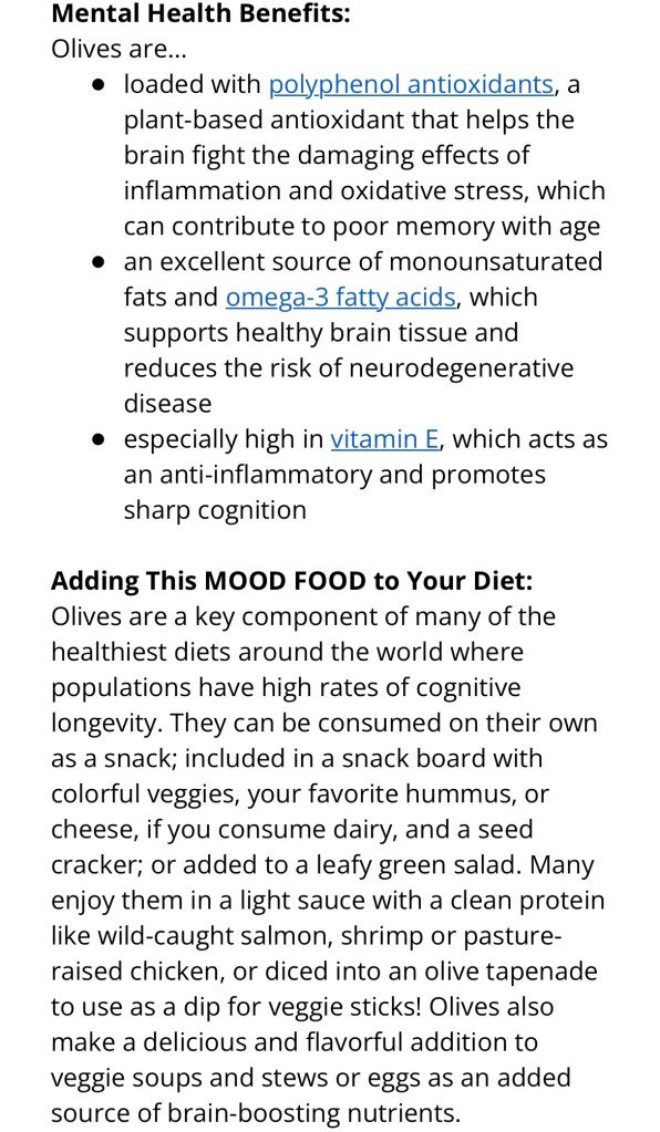 Dr Uma’s Good Food – olives Posted byChilly BellaMarch 31, 2023Posted inDr Uma, Expert Newsletter, find a healthier you, Find the Joy, find time for you, find your inspirationTags:healthy snacks, memory, mental health, mindful eating, nutrition, olive oil, olives Extract from weekly newsletter Share this: Click to share on X (Opens in new window) X Click to share on Facebook (Opens in new window) Facebook More Click to share on Pinterest (Opens in new window) Pinterest Click to email a link to a friend (Opens in new window) Email Like Loading... Published by Chilly Bella Ambassador for good food, good mood and Fine Art Photographer, with a love for the simple joys and sharing my best life with my beautiful family. View more posts