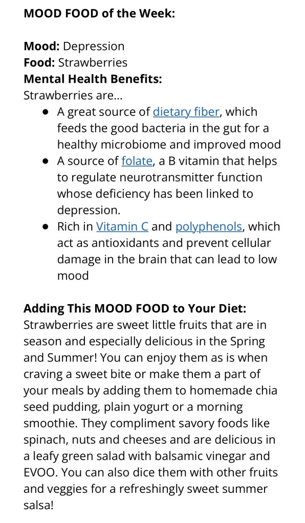 Dr Uma’s Mood Food – Strawberries Posted byChilly BellaMay 28, 2023May 27, 2023Posted inDr Uma, Expert Newsletter, find a healthier you, Find the Joy, find time for you, find your inspirationTags:depression strawberries, happiness, healthy snacks, mental health, mindful eating, nutrition Extract from weekly newsletter Share this: Click to share on X (Opens in new window) X Click to share on Facebook (Opens in new window) Facebook More Click to share on Pinterest (Opens in new window) Pinterest Click to email a link to a friend (Opens in new window) Email Like Loading... Published by Chilly Bella Ambassador for good food, good mood and Fine Art Photographer, with a love for the simple joys and sharing my best life with my beautiful family. View more posts