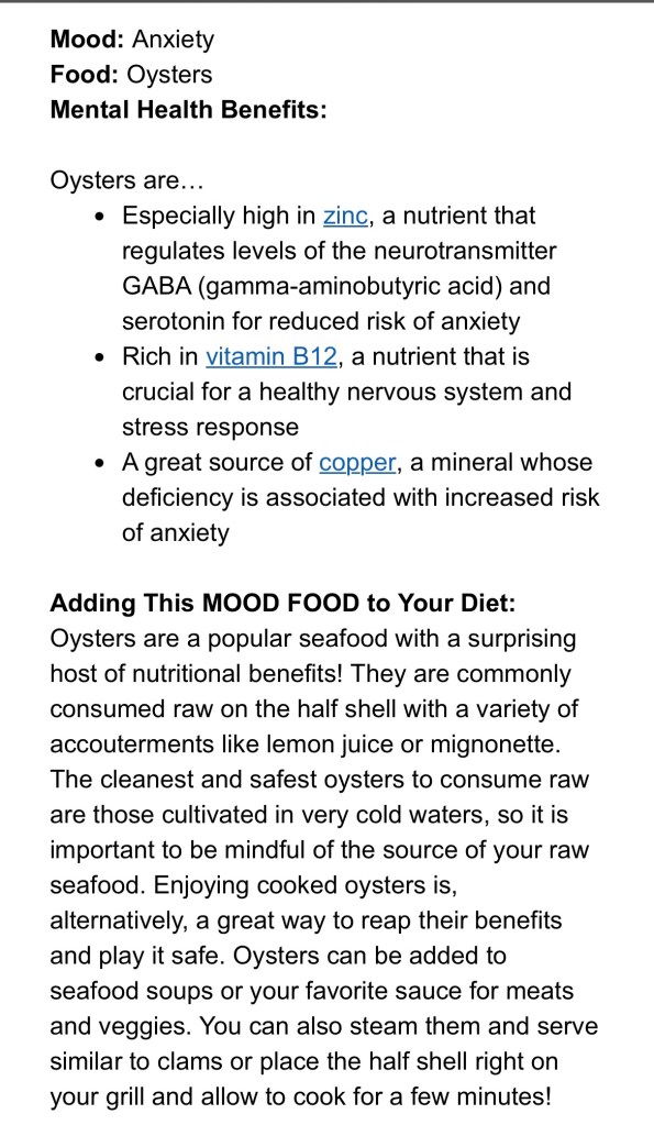 Dr Uma’s Mood Food – Oysters Posted byChilly BellaAugust 26, 2023Posted inDr Uma, Expert Newsletter, find a healthier you, Find the Joy, find time for you, find your inspirationTags:anxiety, calmer you, happiness, healthy snacks, mental health, mindful eating, nutrition, oysters Extract from weekly newsletter Share this: Click to share on X (Opens in new window) X Click to share on Facebook (Opens in new window) Facebook More Click to share on Pinterest (Opens in new window) Pinterest Click to email a link to a friend (Opens in new window) Email Like Loading... Published by Chilly Bella Ambassador for good food, good mood and Fine Art Photographer, with a love for the simple joys and sharing my best life with my beautiful family. View more posts