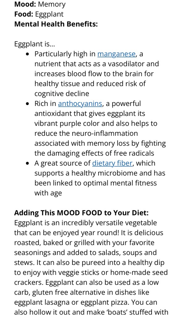 Dr Uma’s Mood Food – Egg Plant Posted byChilly BellaSeptember 1, 2023Posted inDr Uma, Expert Newsletter, find a healthier you, Find the Joy, find time for you, find your inspirationTags:egg plant, memory, mental health, mindful eating, nutrition, productiveness Extract from weekly newsletter Share this: Click to share on X (Opens in new window) X Click to share on Facebook (Opens in new window) Facebook More Click to share on Pinterest (Opens in new window) Pinterest Click to email a link to a friend (Opens in new window) Email Like Loading... Published by Chilly Bella Ambassador for good food, good mood and Fine Art Photographer, with a love for the simple joys and sharing my best life with my beautiful family. View more posts