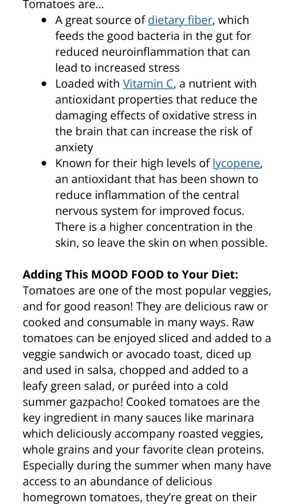 Dr Uma’s Mood Food – Tomatoes Posted byChilly BellaSeptember 8, 2023Posted inDr Uma, Expert Newsletter, find a healthier you, Find the Joy, find time for you, find your inspirationTags:anxiety, calmer you, healthy snacks, mental health, mindful eating, nutrition, tomatoes Extract from weekly newsletter Share this: Click to share on X (Opens in new window) X Click to share on Facebook (Opens in new window) Facebook More Click to share on Pinterest (Opens in new window) Pinterest Click to email a link to a friend (Opens in new window) Email Like Loading... Published by Chilly Bella Ambassador for good food, good mood and Fine Art Photographer, with a love for the simple joys and sharing my best life with my beautiful family. View more posts