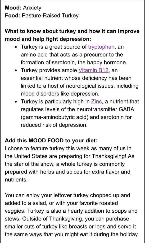 Dr Uma’s Mood Food – Pasture – Raised Turkey Posted byChilly BellaNovember 18, 2023Posted inDr Uma, Expert Newsletter, find a healthier you, Find the Joy, find time for you, find your inspirationTags:anxiety, calmer you, mental health, mindful eating, productiveness, turkey Extracted from weekly newsletter Share this: Click to share on X (Opens in new window) X Click to share on Facebook (Opens in new window) Facebook More Click to share on Pinterest (Opens in new window) Pinterest Click to email a link to a friend (Opens in new window) Email Like Loading... Published by Chilly Bella Ambassador for good food, good mood and Fine Art Photographer, with a love for the simple joys and sharing my best life with my beautiful family. View more posts