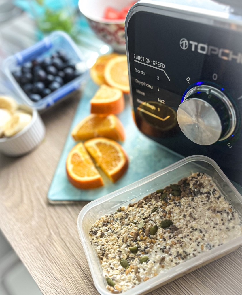 Prepared overnight oats (from above) 1 small banana Strawberries Blueberries Raspberries Juice of ½ an orange A splash of milk or water (to loosen, if needed)